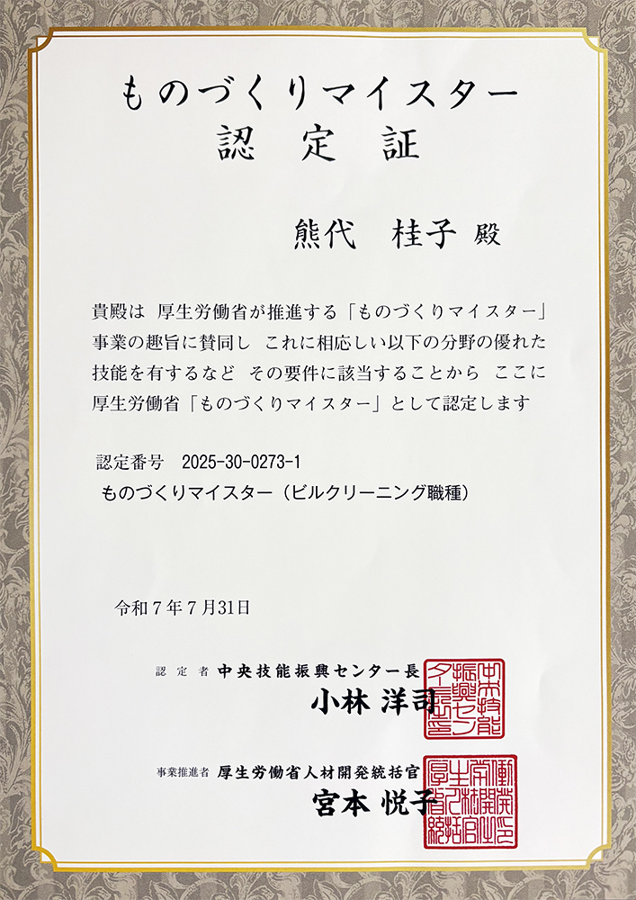 当社従業員が厚生労働省「ビルクリーニング技能士マイスター」に認定されました。 2025.09.29 平素は格別のご高配を賜り、厚く御礼申し上げます。 このたび、当社従業員が 厚生労働省が推進する「マイスター制度」 において、 「ビルクリーニング技能士」としての技能と豊富な経験が高く評価され、マイスターに認定されました。 マイスター制度は、優れた技能を有する人材を国が認定し、その技能を次世代へ継承・普及していくことを目的とした制度です。 今回の認定は、当社の清掃分野における技術力と、地域に根ざした人材育成への取り組みが評価されたものと受け止めております。 今後も当社は、マイスター認定者を中心に、 高度で信頼性の高いビルクリーニング業務の提供 次世代人材の育成と技能継承 地域社会への貢献活動 を積極的に推進してまいります。 Post Share RSS 2025年 夏季休暇(お盆休み)のお知らせ